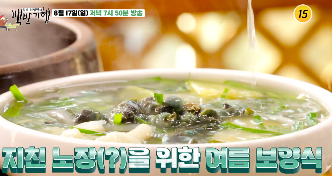 하석주 감독은 함양출신인데요. 함양의 대표 보양식인 다슬기탕과 지리산 흑돼지 구이 맛집이 소개되었습니다. 여름철 보양식으로도 좋은 다슬기탕은 강가 계곡에서 볼 수 있는 민물조개로 피로해소에도 좋고 해장에도 좋다고 합니다.