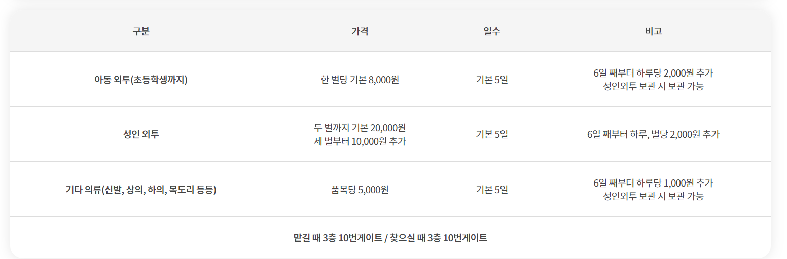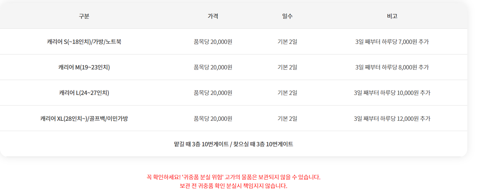 외투, 짐 보관 가격은 위의 사진을 참고하세요.