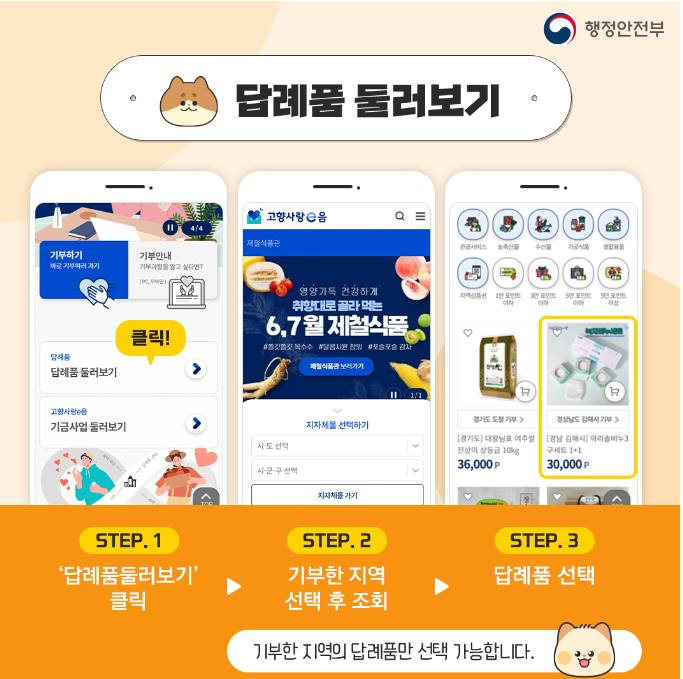 - 답례품 구매 시에는 예를 들어 경상남도에 기부를 완료했다면 경상남도 답례품을 구매가능합니다. 다른 지역 답례품은 구매 불가인 점! 기억하세요.