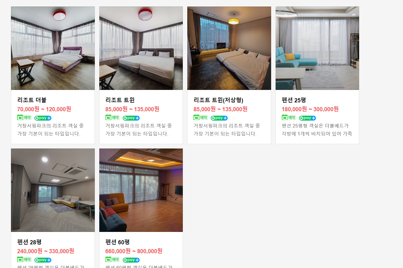 숙소 가격대는 방 유형별로 다르니 아래 사진을 참고하세요. 나는 솔로 촬영은 펜션 60평형 대에서 촬영되었네요.