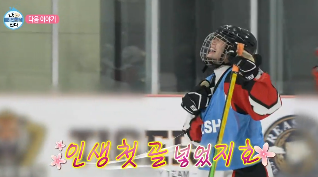 아이스하키를 배운지 한 달 되었다는데 방송에서 경기 중 인생 첫 골을 넣었습니다.