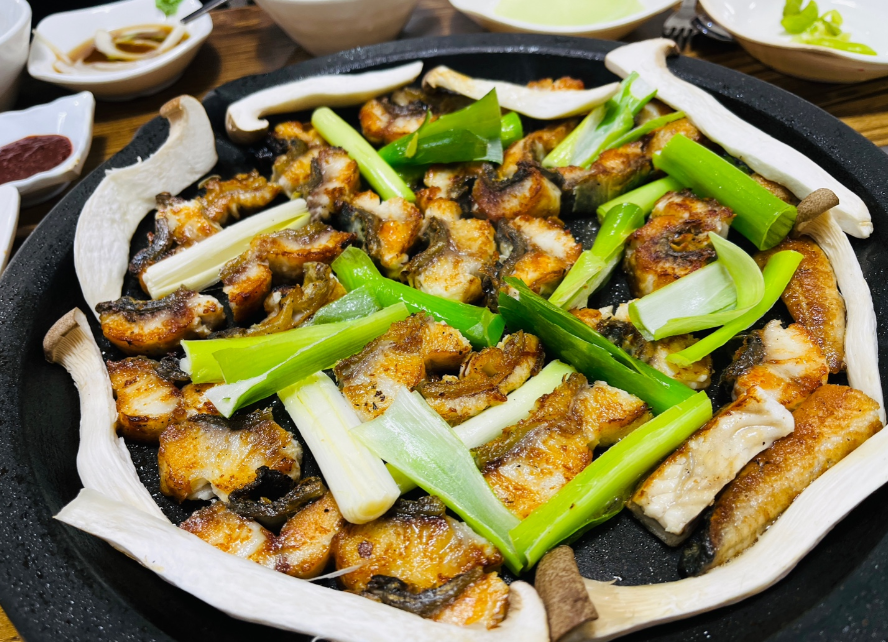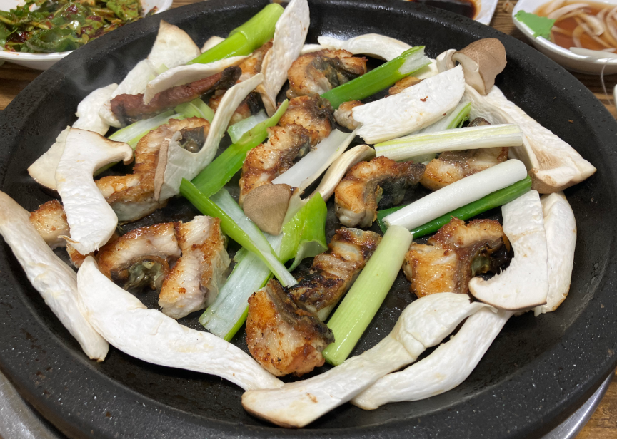 이렇게 몸에 좋은 장어!! 최근 미취학 아동인 아이가 면역력 저하로 몸이 좋지 않아서 몸보신 겸 경산 장어마을에 다녀왔는데요. 아이도 어른도 모두 맛있게 먹었어요. 일단 이곳의 특징은 다른 장어집과 비교했을 때 매우 겉바속촉인 상태로 돌판에 구워져서 나옵니다. 크리스피 한 질감으로 대파, 버섯도 함께 올려져서 나오는데요.