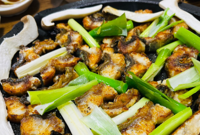 돌판에 대파, 버섯을 같이 올려주는데요.