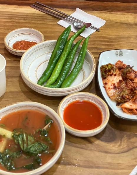 고추, 쌈장, 김치, 파전용 초장, 열무김치였어요.
