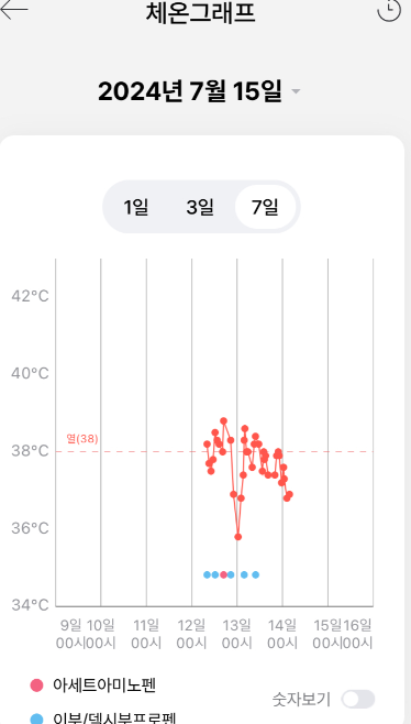 이렇게 아이의 열 상태 변화와 해열제 복용량 등을 한눈에 그래프로 확인도 가능합니다.