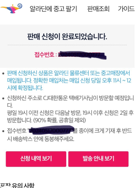 판매 신청이 완료되면 아래와 같이 접수번호가 뜹니다.