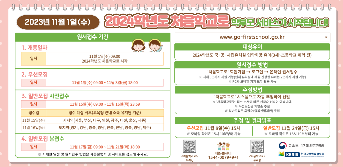 미취학 자녀를 둔 분들이라면 유치원 입소와 관련하여 가을시즌 한창 고민되고 바쁜 시기지요. 국공립 및 사립 유치원 입소를 위한 입소대기 신청을 할 수 있는 '처음학교로' 서비스가 2023년 11월 1일 오픈 예정입니다. 보통 9월부터 유치원 입학설명회, 모집 전형, 입소 신청 등의 일정이 나오는데요. 초등학교 취학 전의 자녀를 두신 분들 중 발 빠른 정보력을 가진 분들은 몇 달 전부터 관심 있는 유치원에 전화해 보고 상담 예약, 입학 설명회 예약 등을 하게 됩니다.