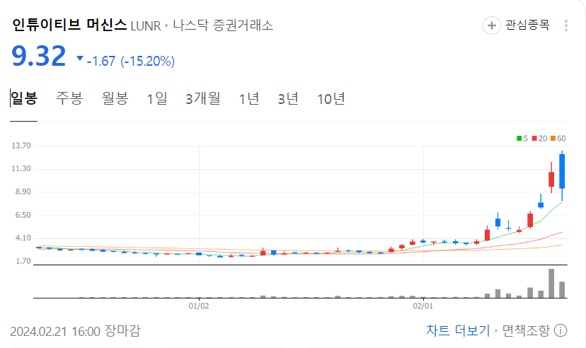 2월 21일 16:00기준 주가의 모습인데요. 이륙시기인 2월 15일부터 급등하는 모습을 보이고 있습니다. 달이 착륙하면 그 뒤로도 기업의 가치가 올라가기 때문에 어느 정도의 익절 선을 유지한다면 수익실현 가능성이 있습니다. 그렇지만 달 착륙 실패 시에는 단기적으로 하락에 대비하셔야 할 것 같습니다.