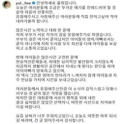 지금부터 두 사람의 이혼 입장문과 인스타그램, 과거 금쪽상담소에 털어놓은 부부간의 갈등을 알아보겠습니다.