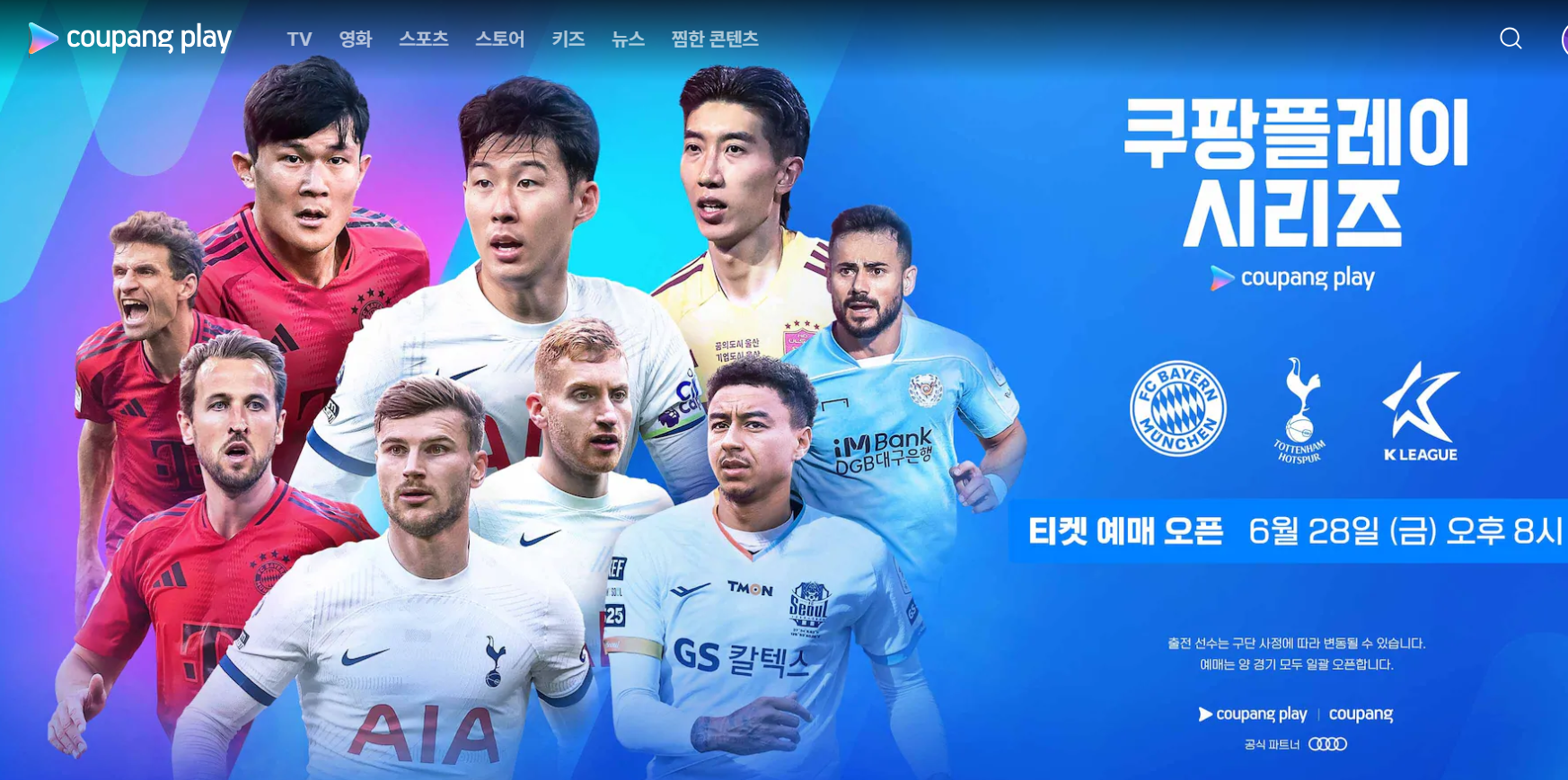 | 2024 토트넘 vs k리그vs뮌헨 경기 예매 정보 쿠팡플레이 시리즈 경기 일정 예매 팁 손흥민 김민재 (0) | 2024.06.19 |