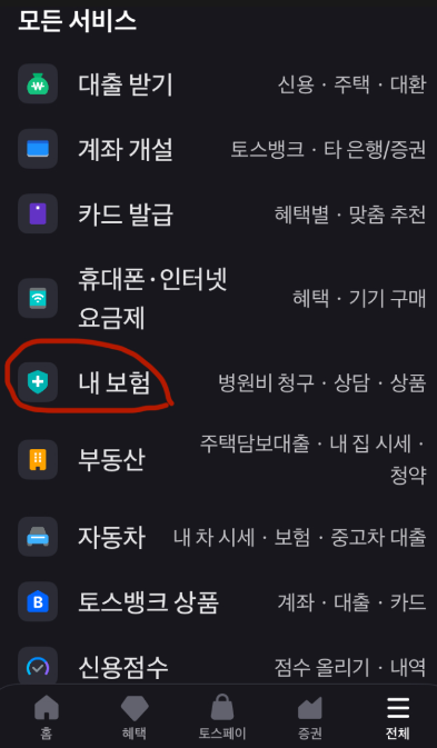 앱의 하단 오른쪽의 '전체'를 누르면 다음과 같이 목록이 뜨는데 그중 '내 보험'을 누릅니다.
