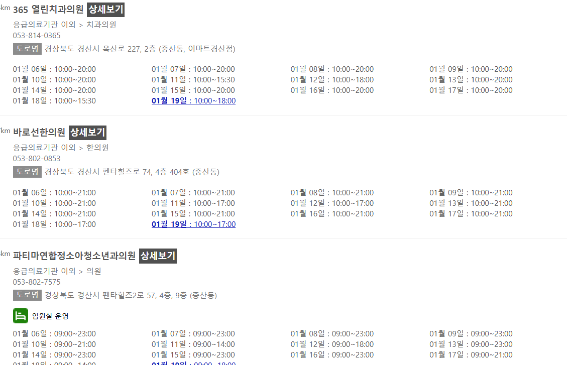 경북 경산시로 검색하면 나오는 일부 병원들을 캡쳐해봤습니다. 검색시점마다 달라질 수 있으니 직접 검색해 보시고 방문하시기 바랍니다.