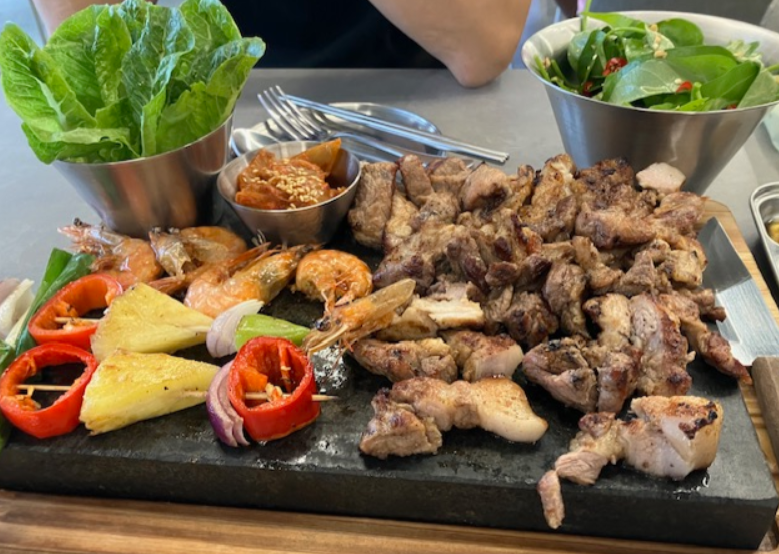 2. 짐 보관 및 카페 휴식, 저녁 더그릴에서 식사 (코리안 bbq랑 모닝글로리, 갈릭라이스), 코리안 bbq는 삼겹살 구이인데 좀 질겼어요. 원래는 공연 보며 먹으려다가 비 와서 공연은 취소되었지요.